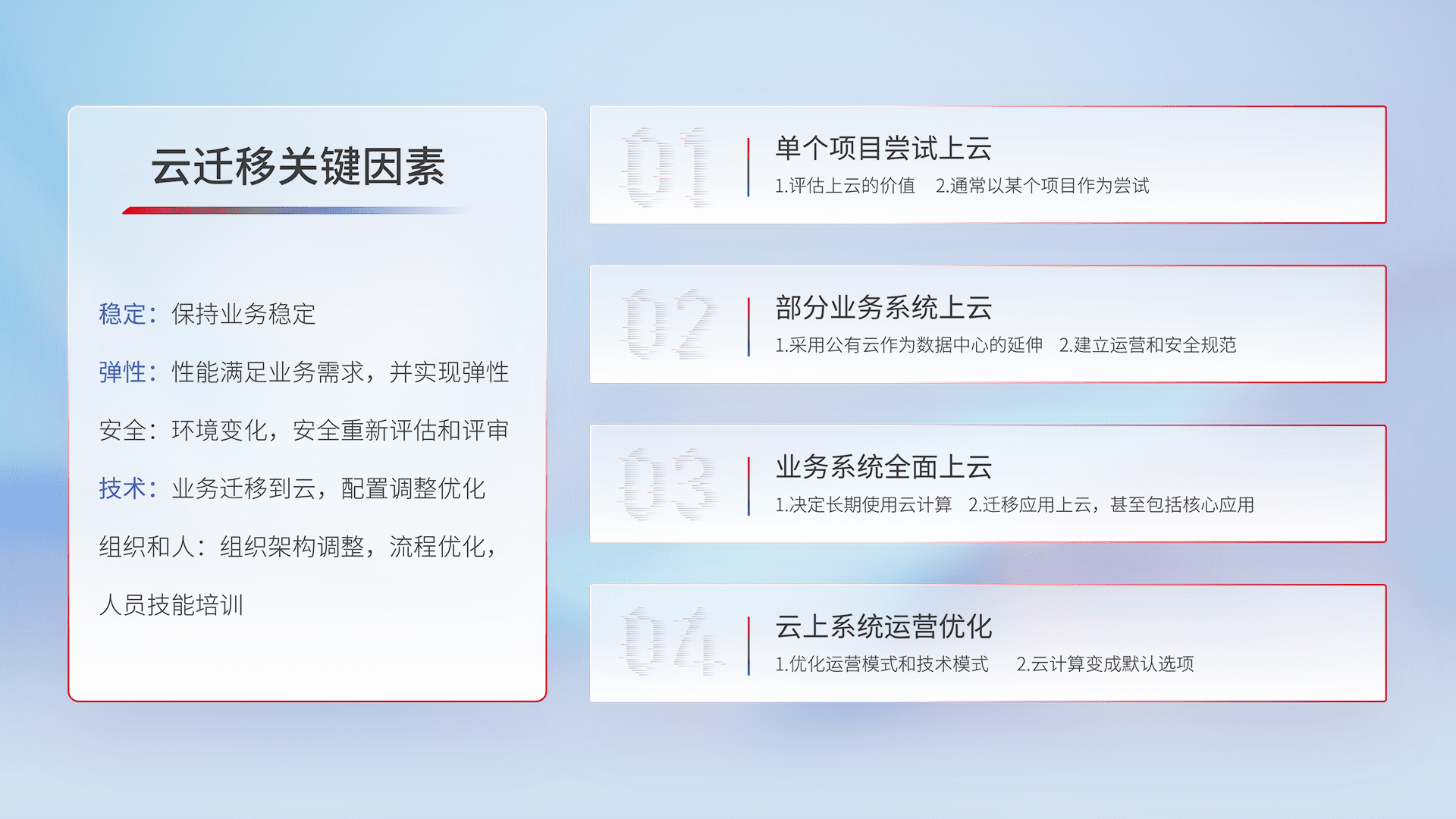 结合实际业务,,,从规划设计、、、、云平台选型、、云原生改造、、、、数据迁移、、集成交付,,,,迁移全过程为客户识别最佳上云路径,,,做好风险识别管理,,,,设计网络架构、、身份权限、、、安全审计合规、、、操作审计、、日志审计、、、、监控告警策略、、、、多站点容灾设计等,,对云上基础设施进行整体规划,,,提升IT治理水平,,,,以满足弹性、、高可用、、高性能的需求。。