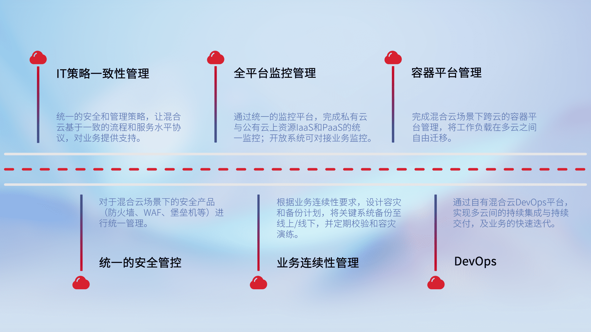通过多云纳管,,以统一的资源数据模型把客户的云资源进行抽象和封装,,,,进而实现对多云资源的统一操作,,,保障云资源管理的可靠性、、稳定性与可用性。。。。量身定制化运维内容,,,配置、、、、开发运维、、、、补丁管理、、备份、、、监控、、、认证和访问管理、、审计和日常巡检等,,,保障在用云过程中的可靠度,,稳定度以及高可用率。。。。